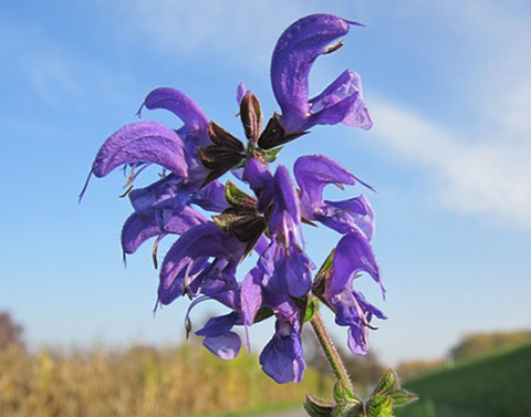 快樂鼠尾草的高可達1公尺,花朵為穗狀花序,精油是由黃色或紫色的花苞所蒸餾,主要產地為匈牙利、保加利亞及法國。