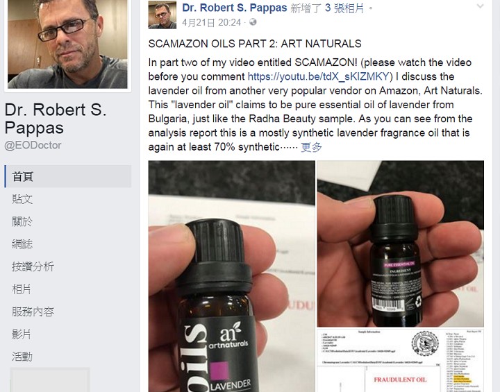 《禾場國際芳療學苑》羅伯帕帕斯博士:美國Art Naturals薰衣草是假精油