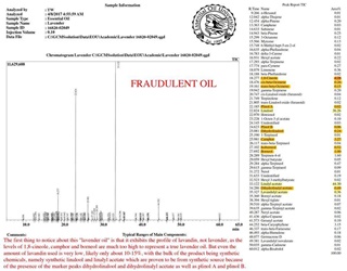 博士說若有人購買過此品牌的薰衣草,會發現有噁心的甜甜香味,那就是因為有大量的香豆素;即使瓶上標籤大大寫有100%純精油且有療效的字樣,但其中的成分卻是0%薰衣草,博士說這完全不能拿來當作純薰衣草使用。