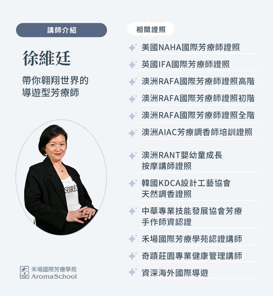 以旅遊的「食」、「住」、「行」分類方式做分享 老師將根據多年的經驗與心得,分享最實用的精油配方。同時,還將介紹老師所親自走遍的各國奇景,讓你在課堂中也能跟著老師一同去旅行。