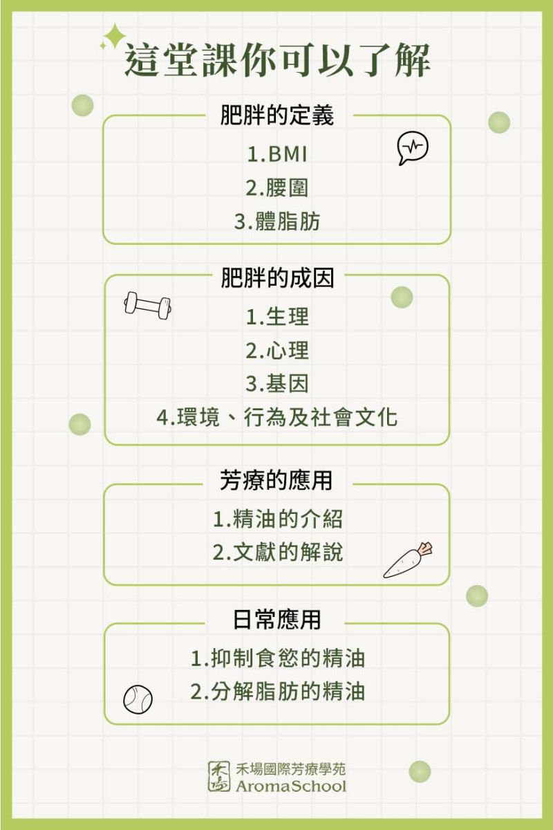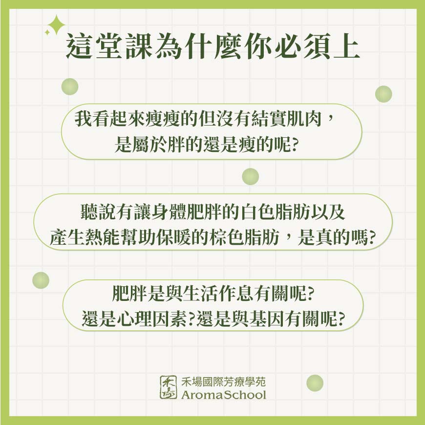 有想過人體如何調控肥胖嗎?肥胖已成現代文明病之一,而肥胖所帶來的不僅影響外觀,也威脅健康。體重控制就成為現在注目的議題之一。這堂課先帶你認識身體造成肥胖的原因,並且以精油的特色及原理來運用。