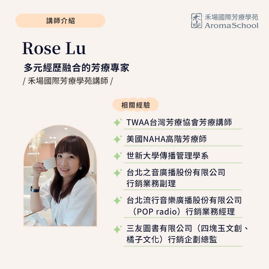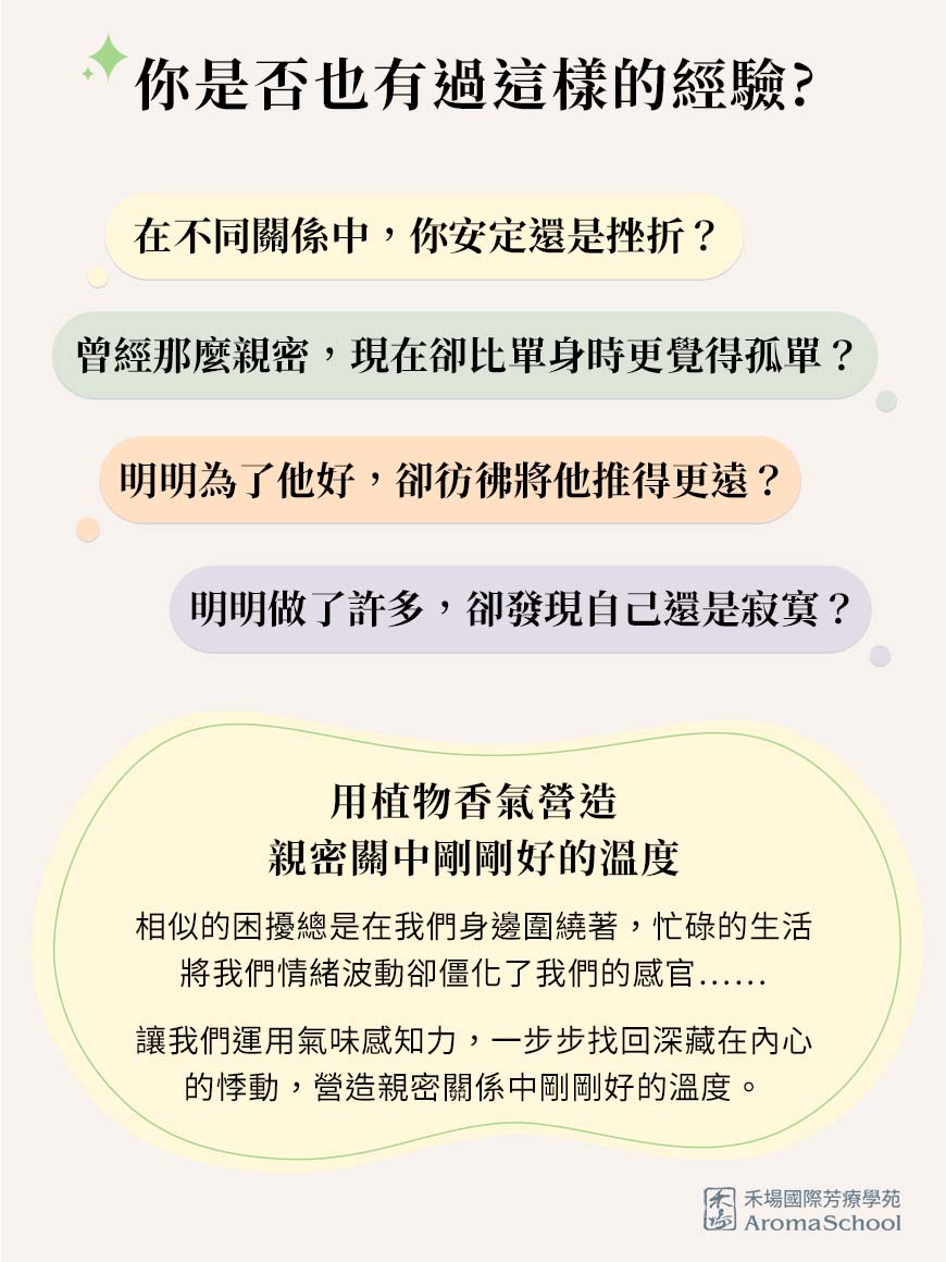 專業的Rose老師,運用植物香氣的特性,引導我們如何將香氣變成與親密關係成為最好的溝通橋樑。讓我們了解在愛別人之前,先關注自己的感受,運用香氣引導,找回內在的能量。