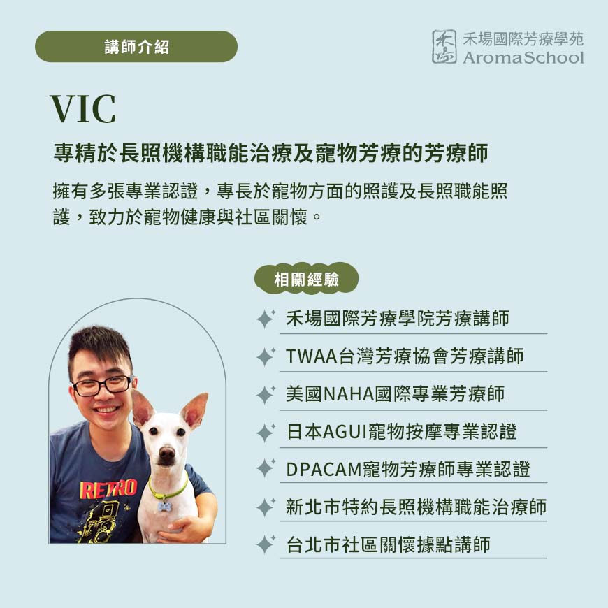 專業的Vic老師自己養了兩隻寵物,對於寵物照護有豐富的經驗,再加上專業的寵物芳療,帶你認識狗狗的身體需求,讓你的狗狗更健康。