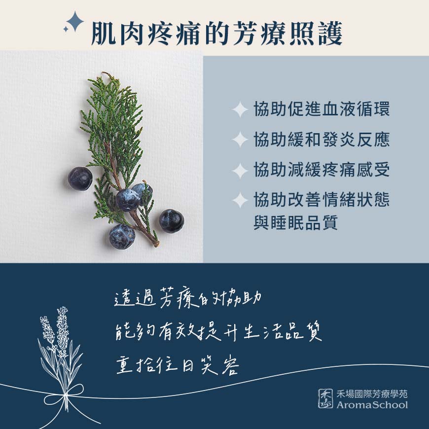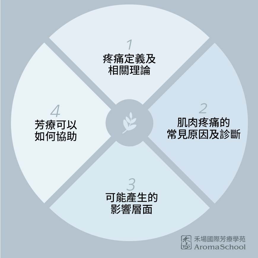 課程全面介紹以肌肉疼痛的原因開始介紹並教學精油的特性及運用。對症下精油的教學方式,讓您輕鬆掌握照護肌肉疼痛長者的技巧,讓長者透過芳療的協助,能夠有效提升生活品質,重拾往日笑容。