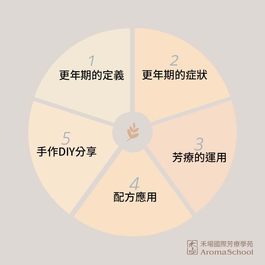課程全面介紹以更年期的症狀開始介紹並教學精油、純露及植物基礎油的運用,以及分享有力文獻。讓您輕鬆掌握照護更年期的技巧,走過這段人生階段。