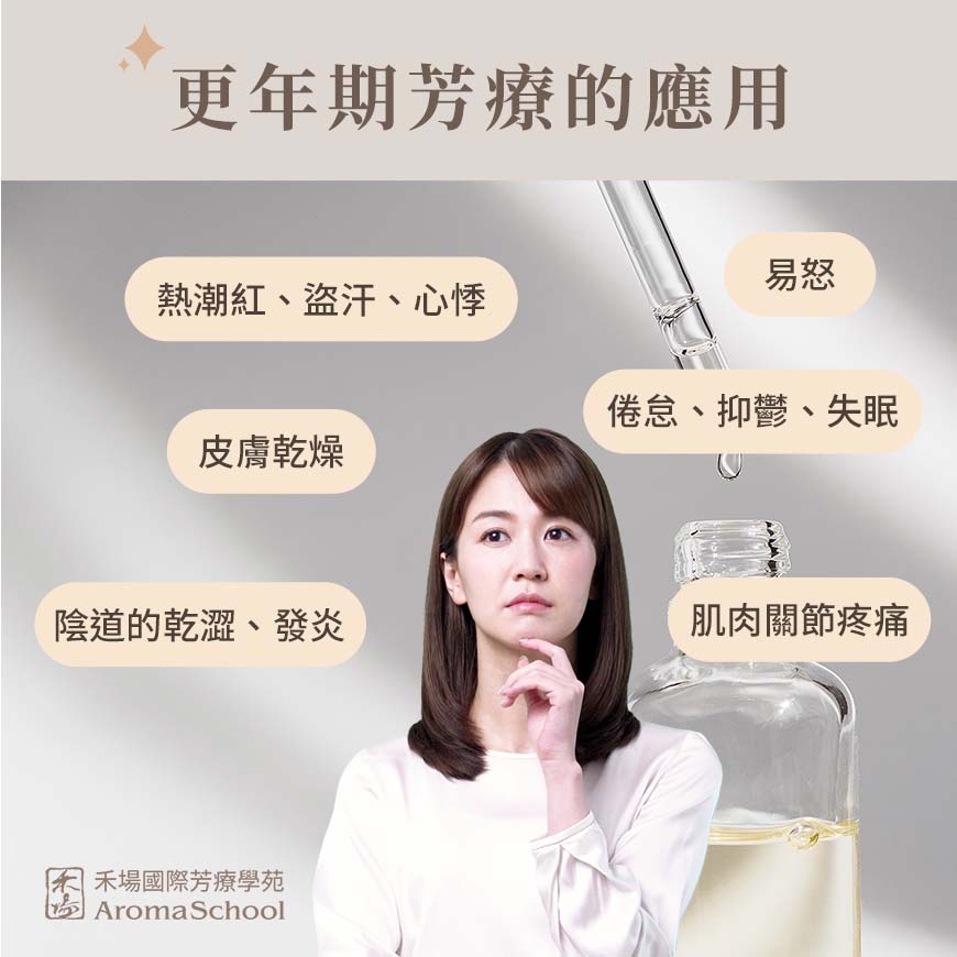 進入更年期,身體與情緒變化令人困擾,但芳療的力量可成為舒緩之道。課程涵蓋更年期症狀、芳療精油運用、及配方示範,將運用類雌激素、平衡賀爾蒙、皮膚護理等,幫助調和體內變化,並分享醫學證據證實芳療的效果。讓您走過更年期,焕發自信活力。