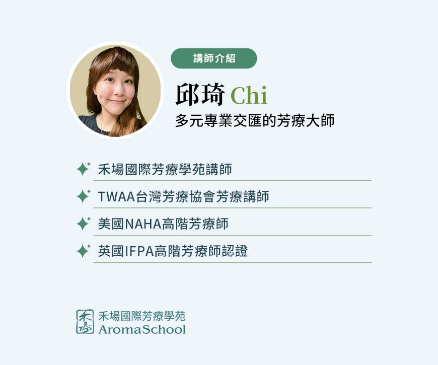 課程總時長為5小時。在本課程中,您將了解精油如何在體內發揮作用,識別某些特性(有益或其他)的成分,評估風險與益處,計算適當的比例等等。講師個人介紹 邱琦Chi 年輕時因為嚴重的皮膚問題而一口氣栽進芳療的世界,在英國求學與工作中大量吸收了歐美芳療知識,回台後在禾場國際芳療學苑取得NAHA Level 2專業芳療師證照,目前在禾場芳療學苑任職講師。擅長純露皮膚保養和痘痘肌膚的處理。身為兩個孩子的媽媽,也對幼兒護理與精油的安全性特別重視,希望能用正確安全的觀念使用精油,讓芳療豐富每一個人的人生。