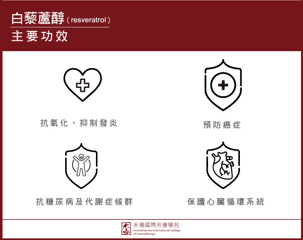 2010年《國際生物化學》與《分子生物學聯合會》表示白藜蘆醇具有多種生化和生理特性,包括抗炎症和免疫刺激活性,以及從疾病預防到心臟保健,甚至包括具有抗衰老的特性。