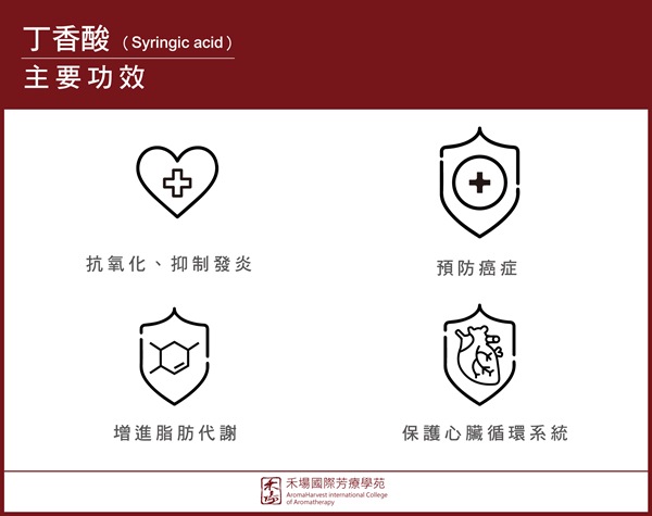 丁香酸的強抗氧化活性歸因於化學分子在第3位和第5位芳香環上有甲氧基的存在,對人體健康有益。《皇家化學學會》雜誌發表丁香酸可以下調脂肪生成基因(Cidea、Pparγ、Srebp-1c、Srebp-2、Hmgcr、Fasn)和炎症基因(Tlr4、Myd88、NF-κB、Tnfα、Il6),且會上調肝臟中的脂肪酸氧化基因(Pparα、ACsl、Cpt1、Cpt2),另外,同時也會降低肝臟脂肪酶活性和增加脂肪酸氧化酶。