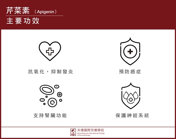 《藥學研究》發表指出芹菜素是一種天然存在的植物黃酮,是一種生物活性黃酮,具有抗炎,抗氧化和抑制癌細胞特性。流行病學研究表明,富含黃酮的飲食可以降低某些癌症的風險,或是讓癌細胞自我毀滅。《生物醫學與預防營養》發表,芹菜素(類黃酮)具有抗高血壓,抗糖尿病以及其他治療作用。其中還發揮著腎臟保護作用,它們會影響促進利尿的幾種腎臟因素,這可能有助於降壓作用,並且支持著腎臟功能。